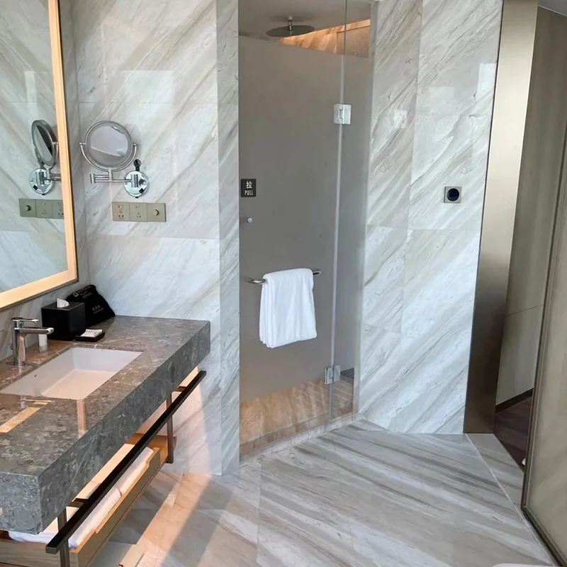 Per costruire una vacanza calma e simile al bagno, il marmo bianco Ajax è l'ideale. Le sue vene delicate e fluenti danno a qualsiasi posto un po 'di eleganza e aiuta a creare un'atmosfera più aperta e ricca. Un pavimento del bagno in marmo bianco offre sia durata che bellezza senza età, quindi migliora immediatamente l'area.