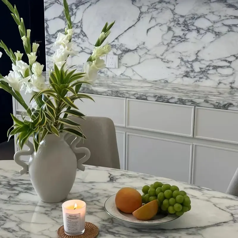 Le proprietà che riflettono la luce del marmo bianco araboscato sono ben note per illuminare qualsiasi area. La sua combinazione di colori sommersi non è solo sofisticata, ma integra anche molti palletie e materiali di colore diverso.