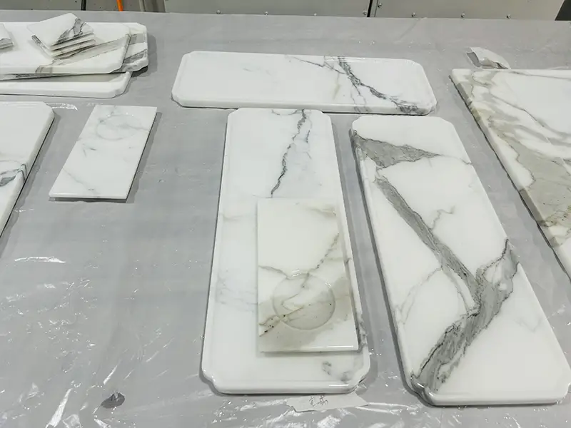 Facciamo molto di più che tagliare la pietra su Wow Stone. Collaboriamo con te per produrre esattamente ciò di cui hai bisogno. Possiamo abbinare colori, grano e tono alla tua visione perché abbiamo più di 1.000 metri quadrati di lastre di calacatta in magazzino. Una piccola piastra di marmo in una finitura opaca è quello che vuoi. Un vassoio in marmo rotondo intarsiato d'oro? O una collezione di oggetti di arredamento a piastre di marmo di dimensioni simili? Abbiamo te.