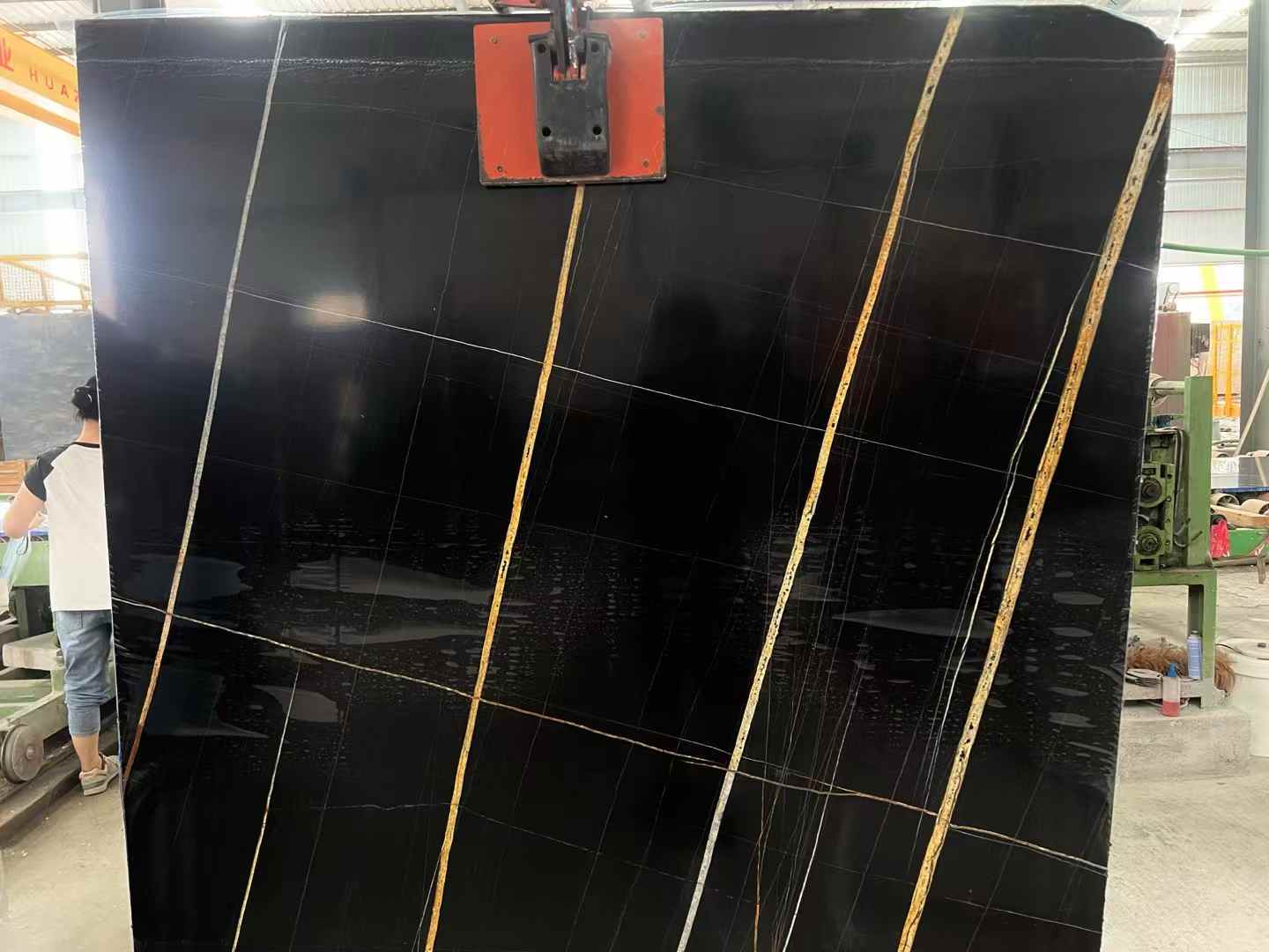 Con la giusta combinazione di sfondo nero profondo, oro forte e una vena bianca adeguatamente proporzionata, qualsiasi superficie può essere trasformata in un centrotavola. Viene utilizzato principalmente su camere di marmo nero, sia come tavolo da pranzo in marmo nero, una vanità del bagno in marmo nero che si sta avvicinando o un camino in pietra nera che è un punto focale. La maggior parte delle pietre ingegnerizzate cercano di ottenere questo look, ma non c'è niente come la cosa reale.