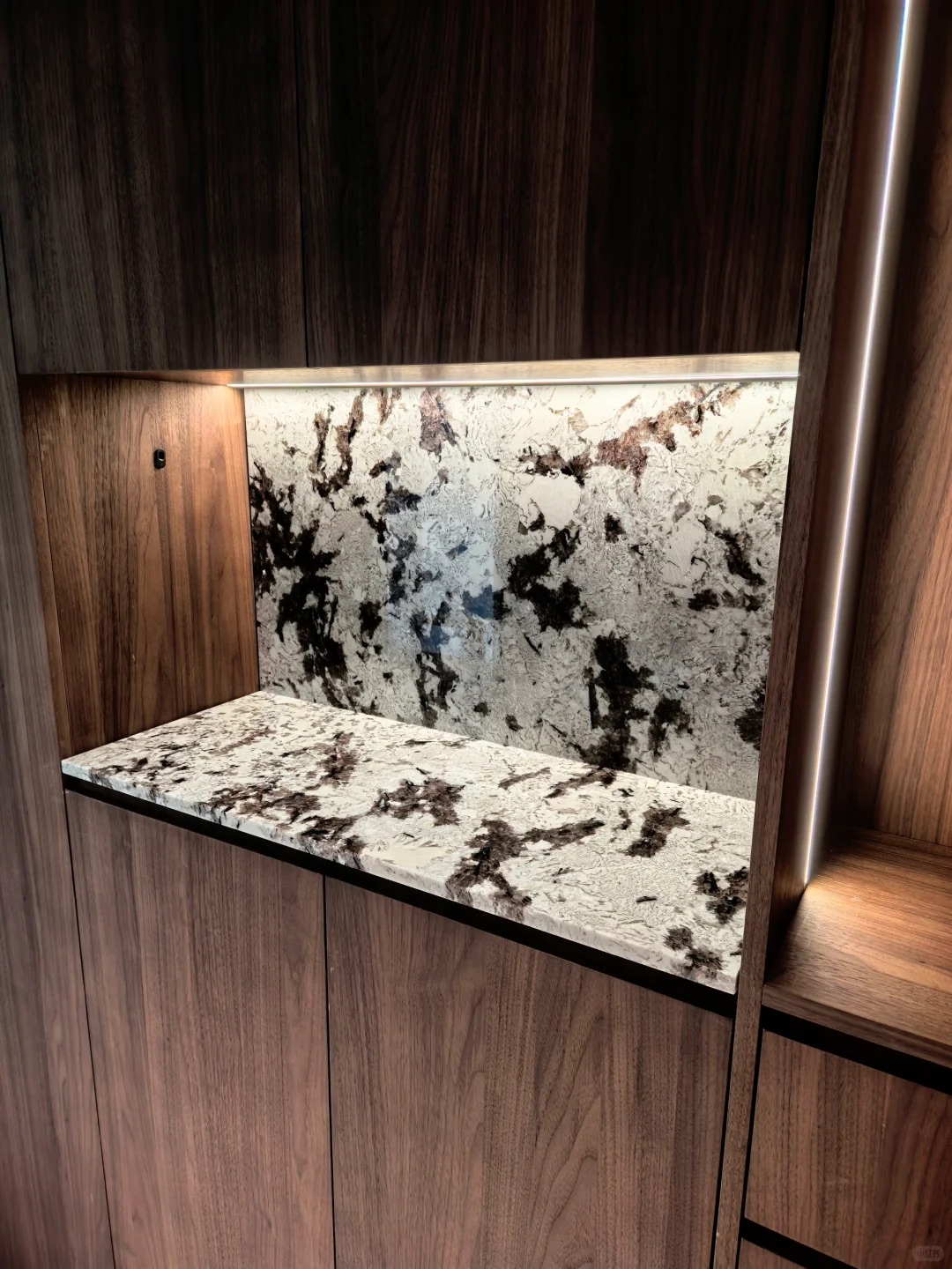 Un controsoffitto in marmo nero o un design minimalista in pietra con linee pulite funziona meglio in spazi eleganti e moderni.Granito d'oro di magmaPuò rendere una stanza più calda senza essere troppo.