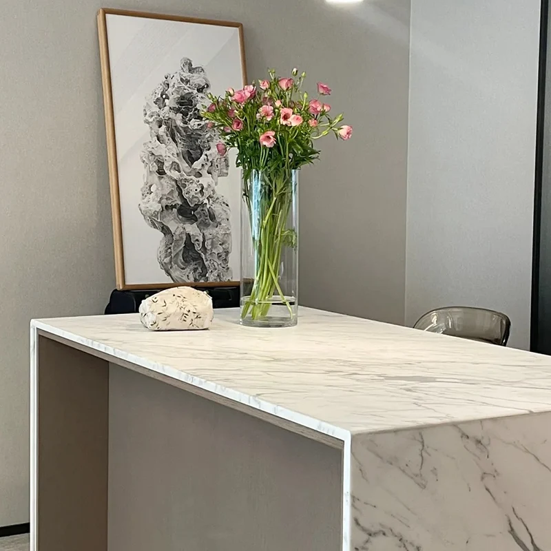 Per contrasto, utilizzare piani di lavoro in marmo statuario con mobili scuri o neutri. Un bordo a cascata sulla tua cucina bianca dell'isola in marmo evidenzierebbe la venatura. Top Dimensioni dell'isola comune: 2400 x 1200 mm o taglio personalizzato.