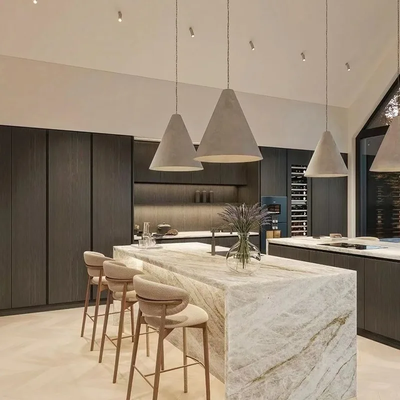 Europa: favorisce i progetti minimalisti con lastre da 2 cm, utilizzando spesso piastrelle di backsplash di quarzite Taj Mahal per abbinare il contatore principale.